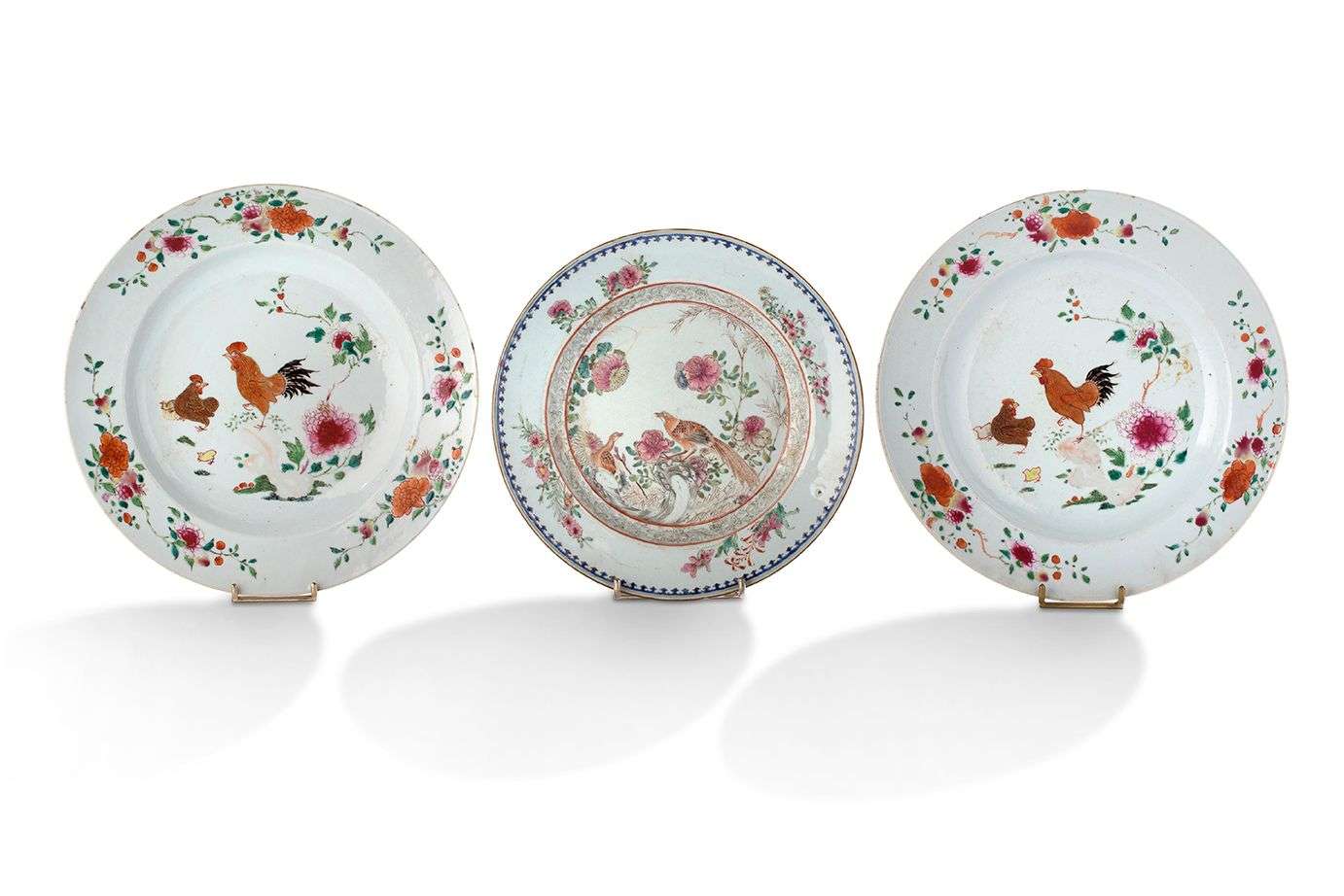 Ensemble de six assiettes en porcelaine de la famille rose, dont deux à décor de coqs et pivoines, les quatre autres à décors floraux variés.