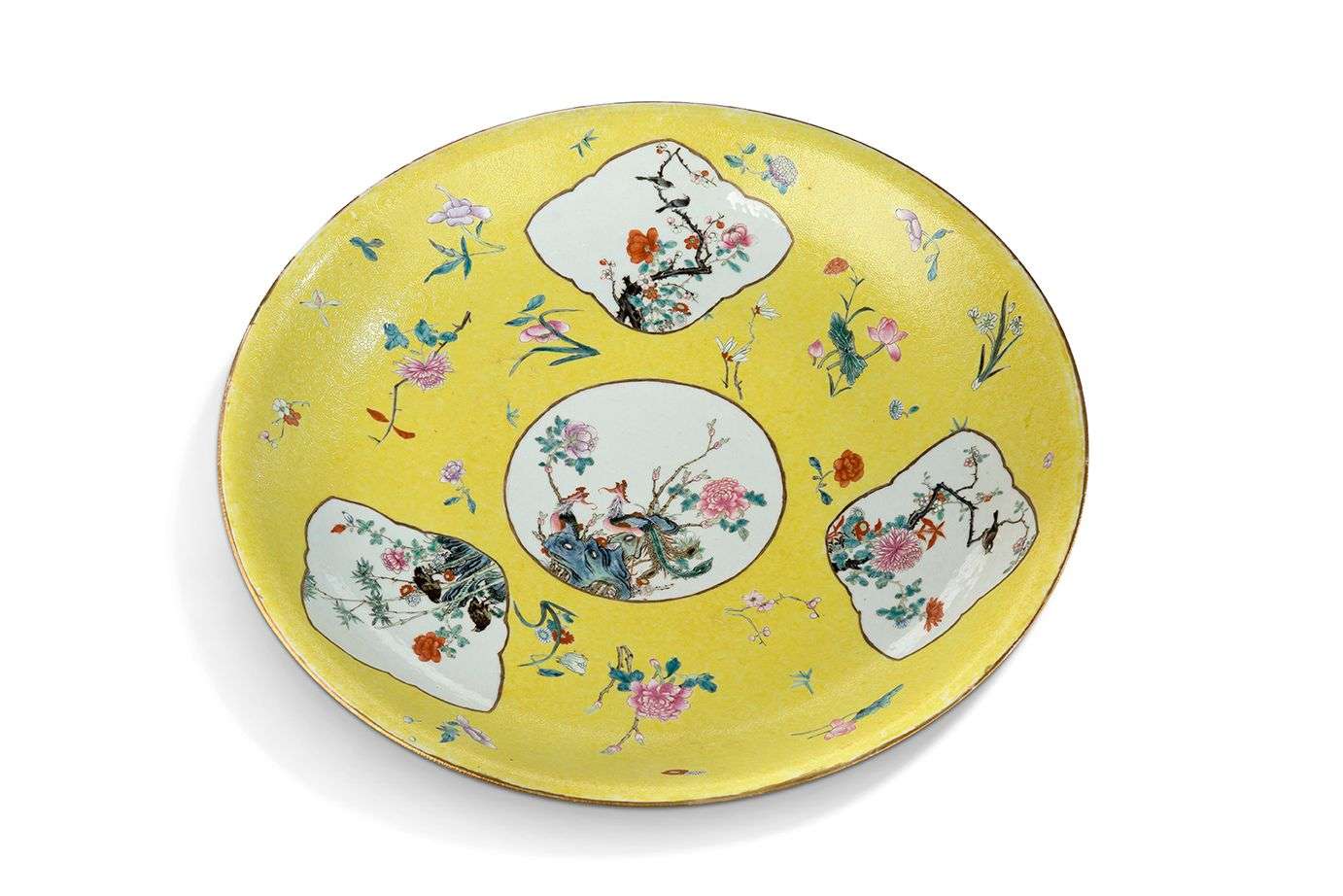 Très important plat en porcelaine de la famille rose, décoré de quatre réserves abritant des oiseaux et les fleurs des quatre saisons.