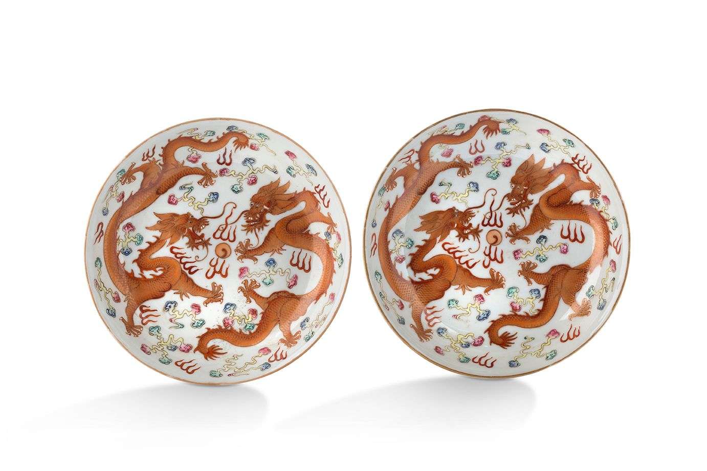 Paire de petits plats en porcelaine aux émaux polychromes ornés de deux dragons pourchassant la perle parmi les nuées.