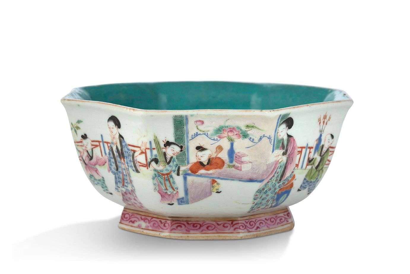 Coupe hexagonale en porcelaine de la famille rose à décor de femmes et d'enfants dans un jardin. L'intérieur émaillé turquoise. La base émaillée turquoise avec une marque Tongzhi à six caractères en zhuanshu en rouge-de-fer.