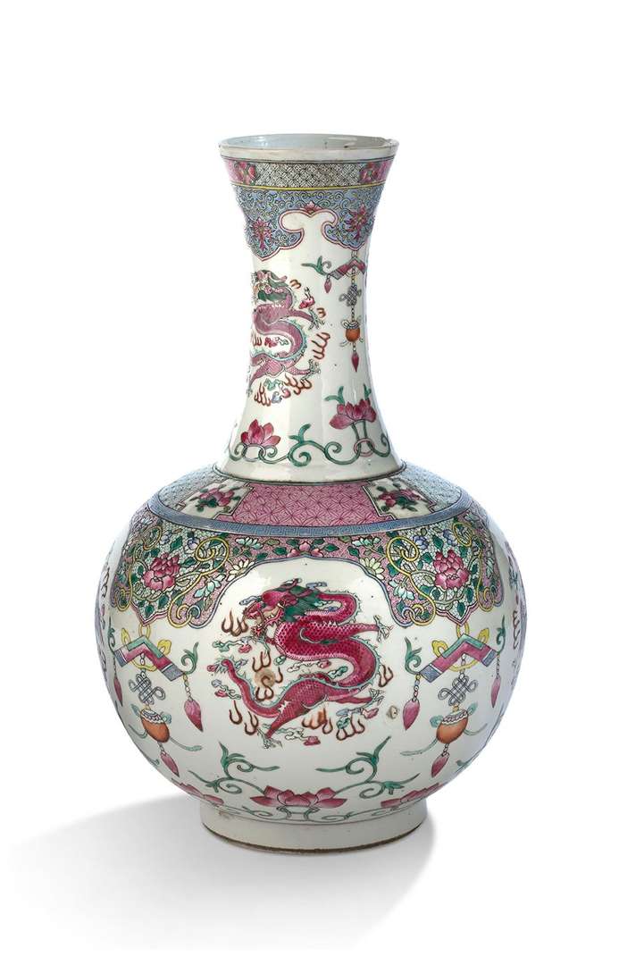 Vase bouteille en porcelaine de la famille rose, le col et la panse globulaire à décor de phénix et dragons en médaillon alternant avec des pierres sonores à pendeloques.