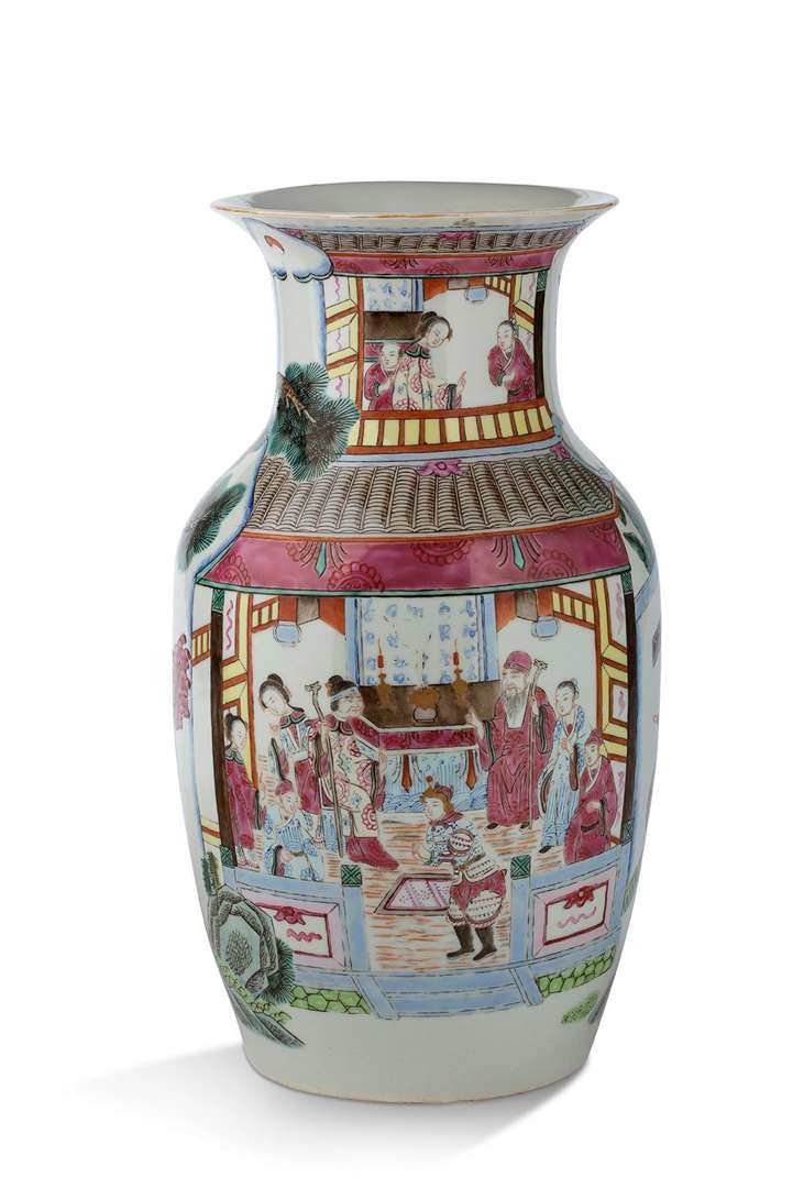 Ensemble de deux vases en porcelaine de la famille rose décorés de personnages dans un intérieur et de cavaliers attaquant.