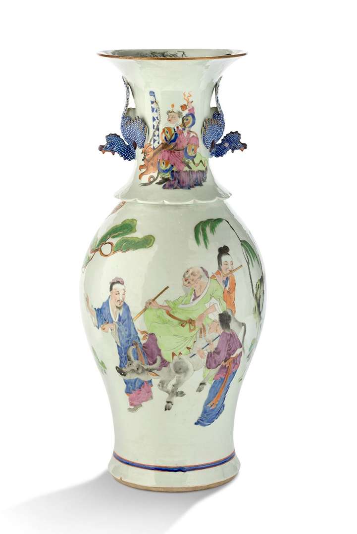 - DÉBUT DU XXe SIÈCLE Paire d'importants vases yenyen en porcelaine de la famille rose, décorés d'une rencontre entre des immortels, dont Laozi sur son buffle et Liu Hai avec son crapaud à trois pattes.