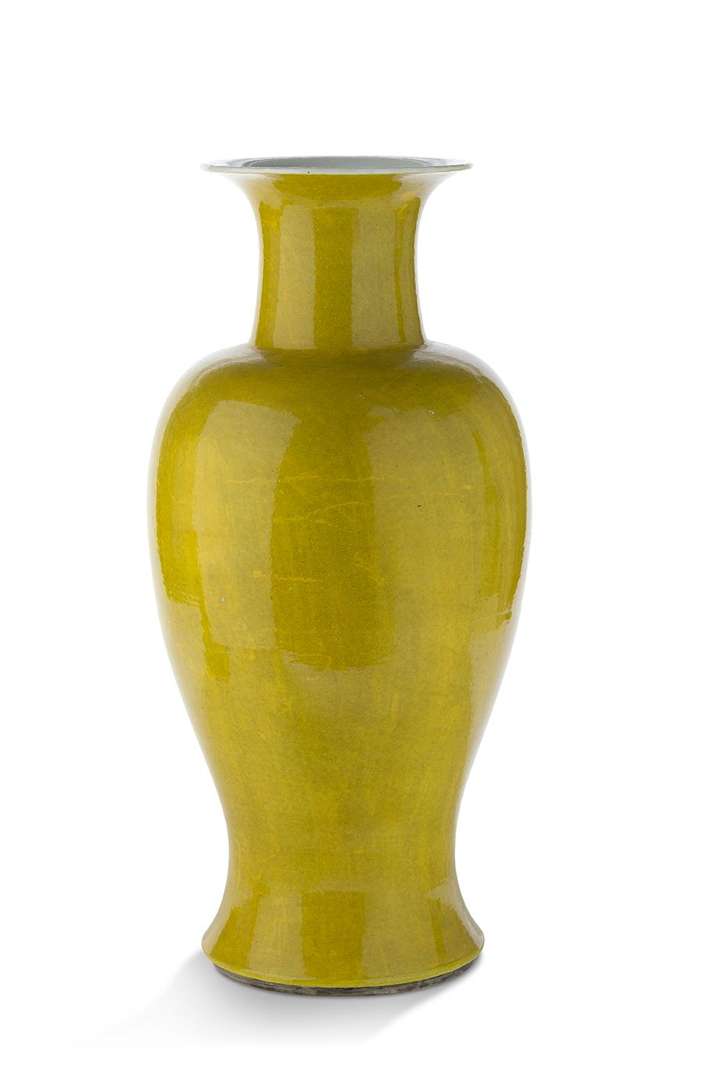 Paire d'importants vases yenyen en porcelaine monochrome jaune. La base avec une marque
