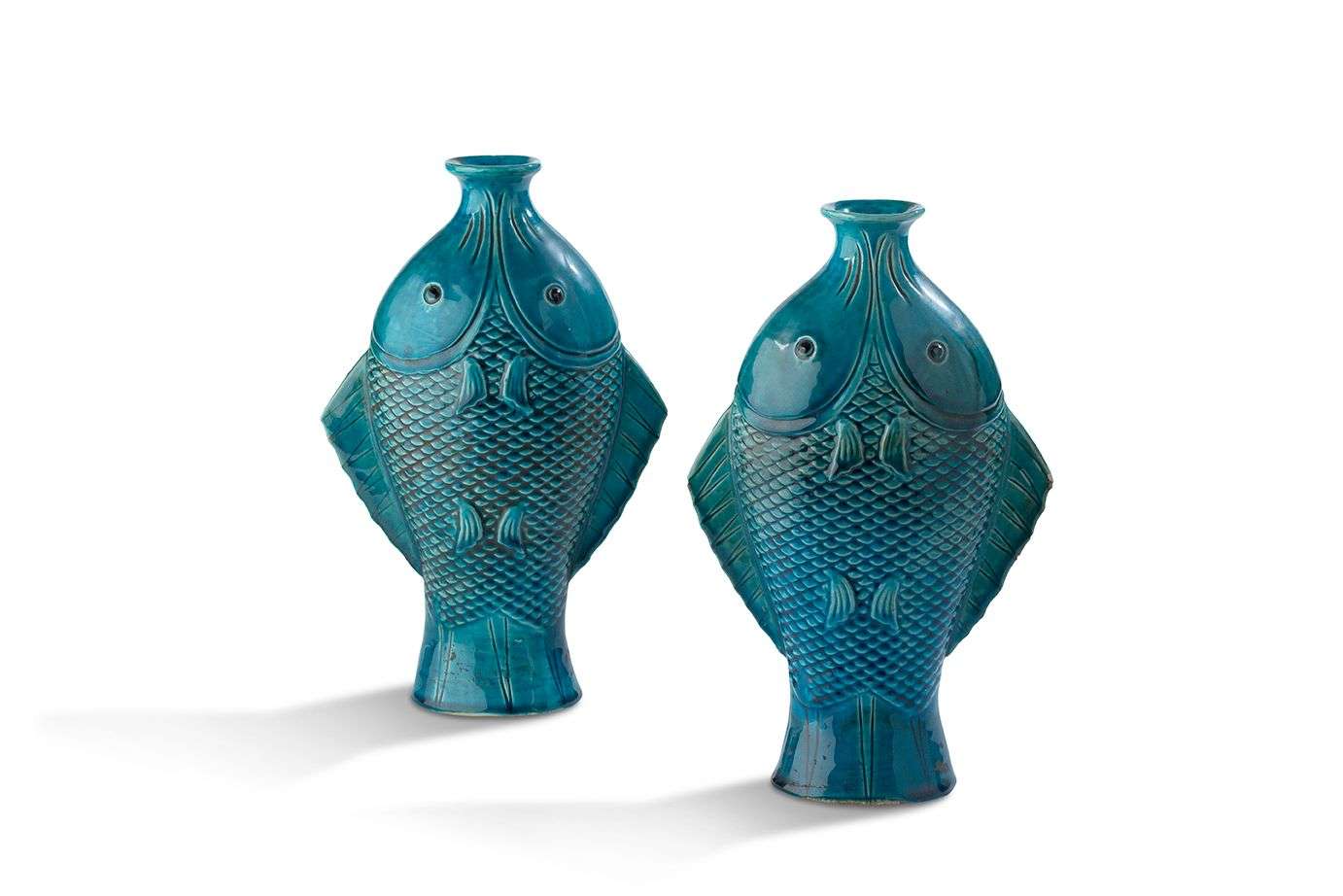 Paire de vases « double-poisson » en porcelaine monochrome turquoise, les deux poissons accolés avec les écailles et les nageoires délicatement détaillées.
