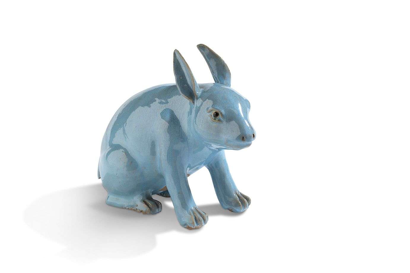 Statuette de lapin assis en porcelaine émaillée bleu pâle.