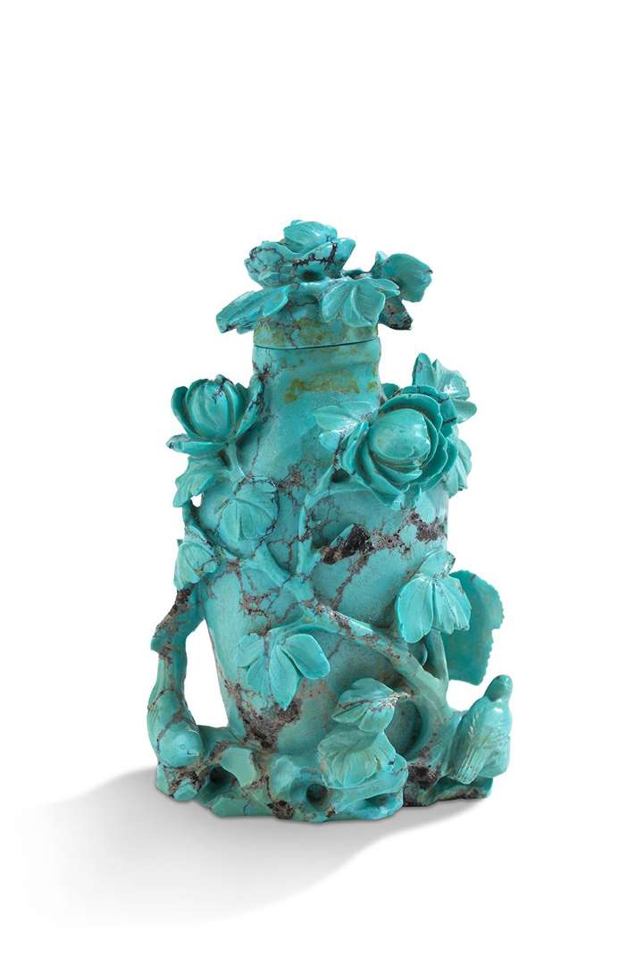 Petit vase couvert en turquoise sculptée décoré d'un oiseau posé parmi les branches de prunus et pivoines.
