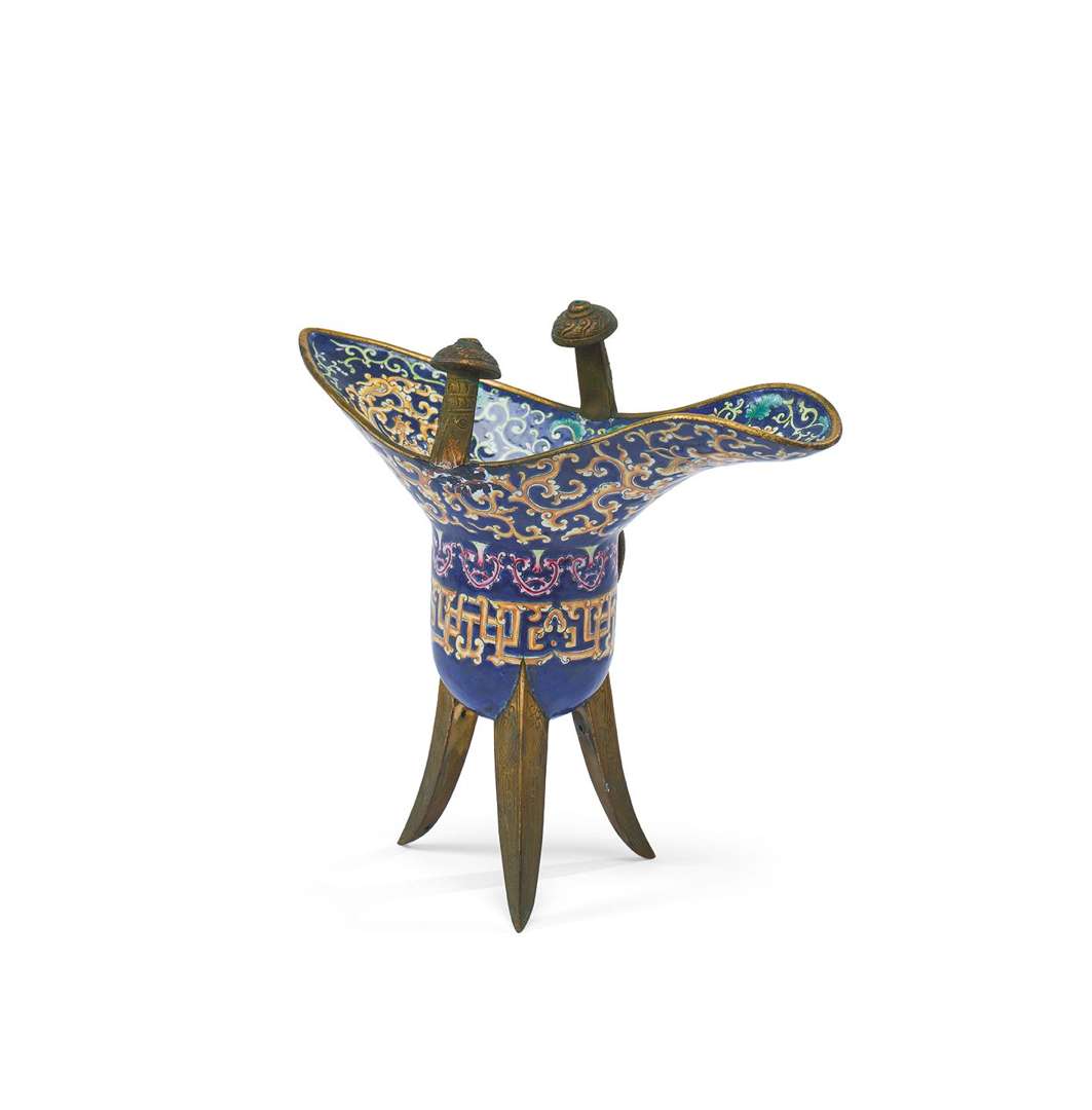 Verseuse tripode Jue en bronze doré et émaux peints polychromes, décorée de dragons et phénix archaïsants parmi les rinceaux et lotus. Le col souligné d'une bordure de têtes de ruyi surmontant une frise de dragons kui archaïsants.
