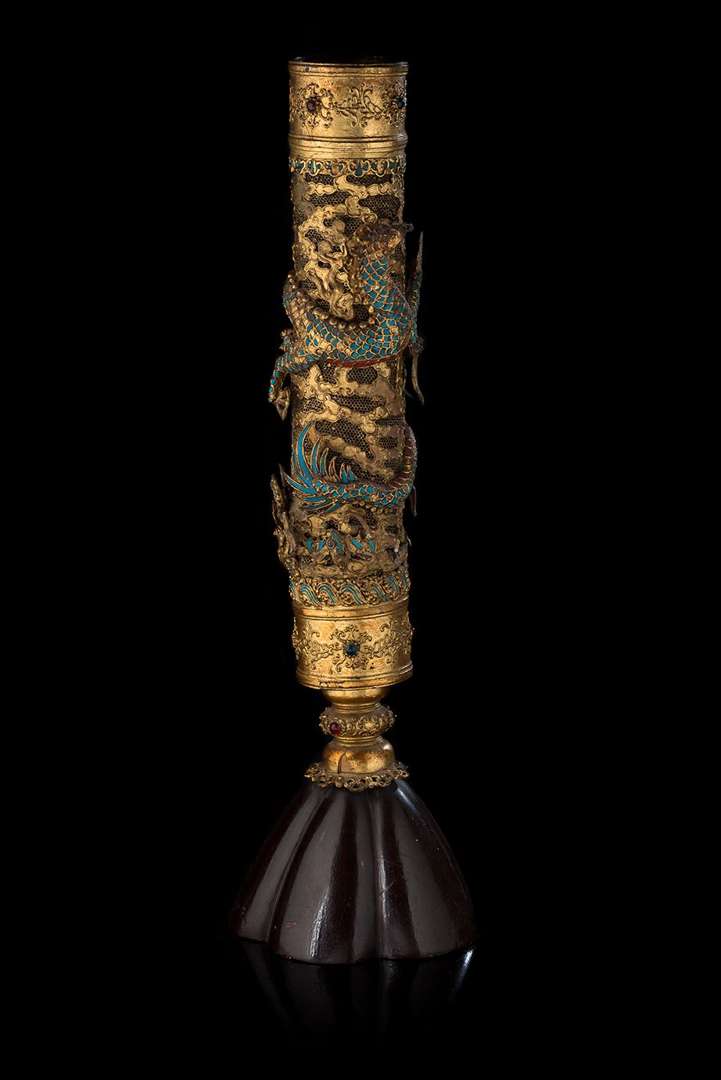 Grand porte-bâtons d'encens cylindrique en bois et papier mâché laqué doré formé d'une résille parcourue de nuages, avec des chauve-souris et un grand dragon en relief pourchassant la perle au-dessus des flots. L'ensemble rehaussé de papier rouge et plumes de martin-pêcheur.