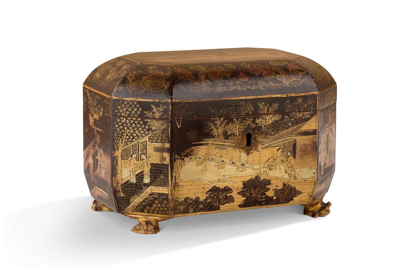 Coffret à thé en bois laqué noir et or à décor de scènes de production du thé. Le couvercle avec des dragons pourchassant la perle parmi les nuées. L'intérieur avec deux boîtes en étain ciselé. Avec sa clef.
