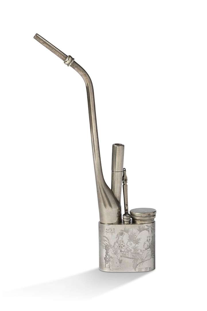 Pipe à eau en paktong à décor ciselé de personnages dans un jardin et d'un poème.