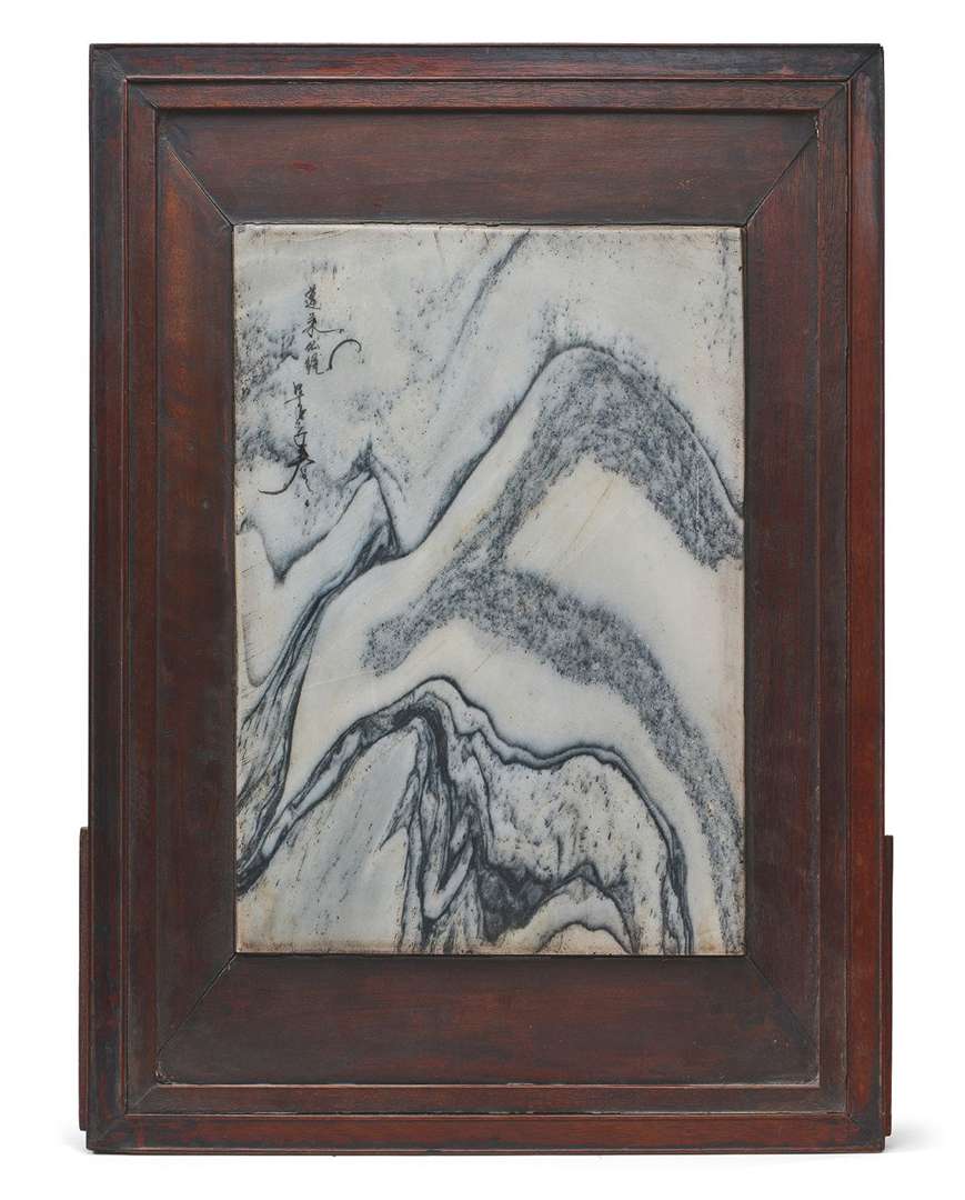 « Pierre de rêve » à marbrures grises rectangulaire dans un panneau en bois naturel. Une inscription en partie supérieure gauche.