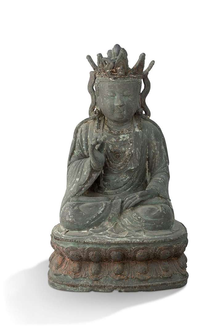 Statue de Guanyin en bronze, assise en vajrasana sur une double base lotiforme, une main en vitarka mudra, vêtue d'un long manteau et coiffée d'une couronne avec une effigie d'Amithaba.