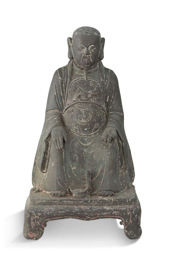 Statue de Zhenwu en bronze à patine brune, le dieu taoïste figuré assis avec un petit serpent à ses pieds.