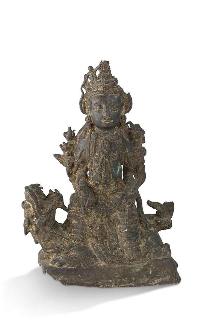 Statue de Manjusri en bronze à patine brune, assis en rajalalitasana sur un lion bouddhique, tenant des tiges de lotus s'épanouissant sur ses épaules.