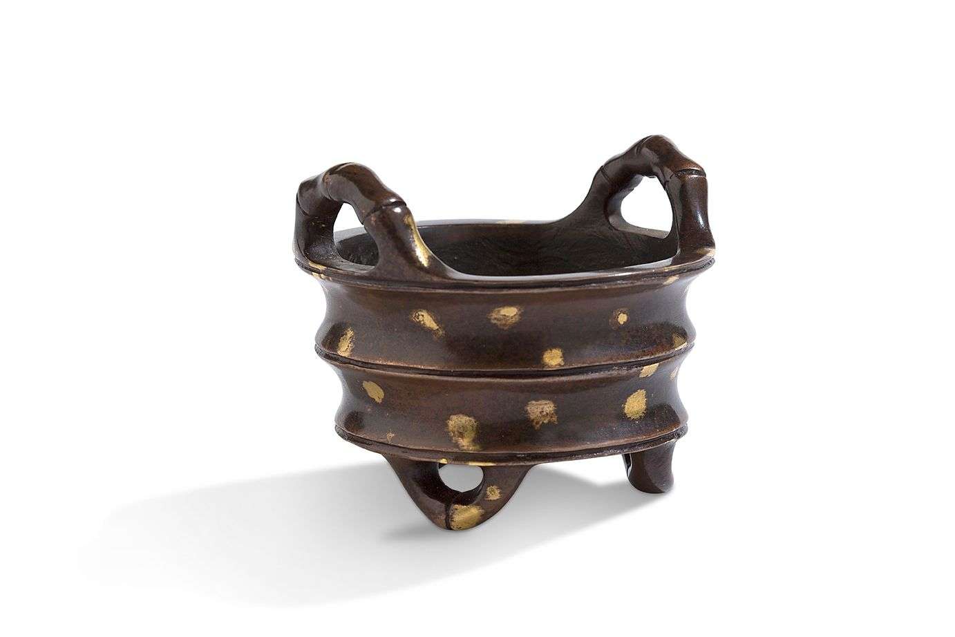 Petit brûle-parfum en bronze à décor dit « goldsplash ». Le corps tubulaire légèrement évasé, reposant sur trois petits pieds et avec deux petites anses. L'ensemble imitant le bambou.