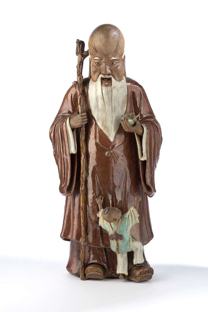 Statue de Shoulao en grès de Shiwan à couvertes brune et céladon, le dieu de la Longévité debout tenant un grand bâton noueux et une pêche d'immortalité, accompagné d'un enfant rieur.