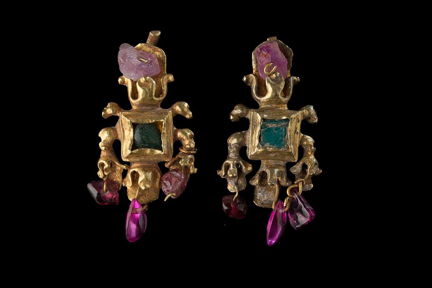 Paire d'ornements d'oreille en or, le centre avec un chaton carré d'où s'élèvent six tiges foliacées accueillant des pendeloques en pierres de couleur. L'arrière avec une tige recourbée.