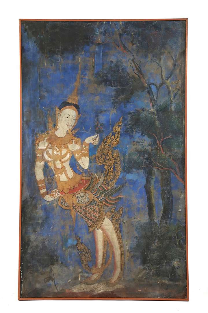 Peinture à l'encre et pigments sur toile figurant une kinnari sous un arbre, tenant un rameau chargé de fruits. Sous verre et dans un encadrement postérieur.