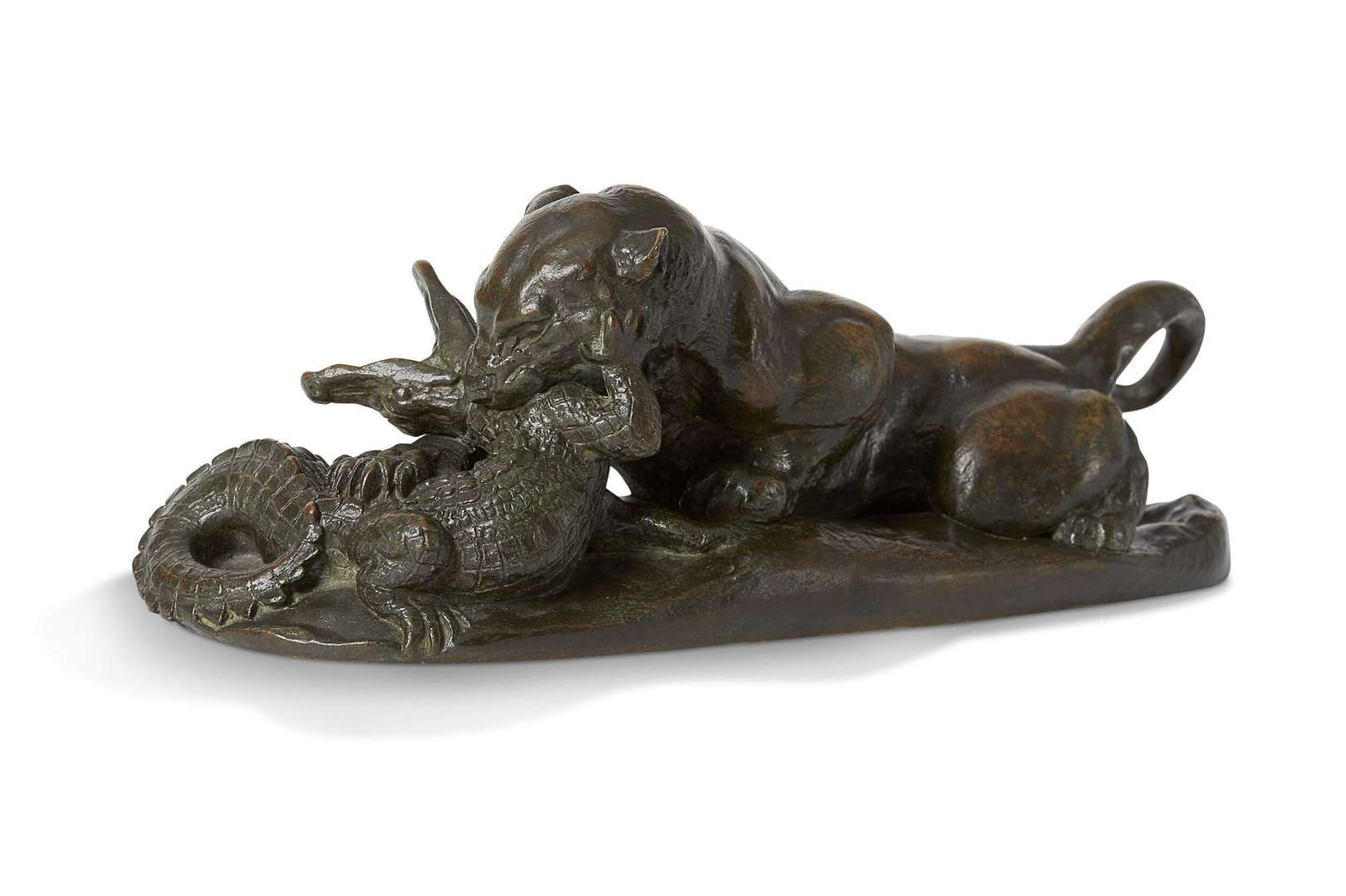 - Antoine-Louis Barye (1795-1875), Jaguar dévorant un crocodile, bronze à patine marron, signé sans cachet de fondeur, long. 24,5 cm, Paris, Musée du Louvre, Legs Thomy-Thiéry, OA 5756