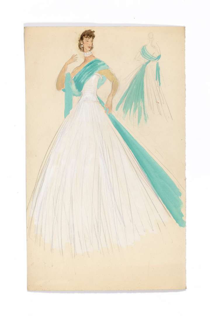 A set of two inscribed women's costume projects, gouache and graphite on paper, the first one unsigned, the second one signed lower right and inscribed 'Suzanne Fabry' on the reverse