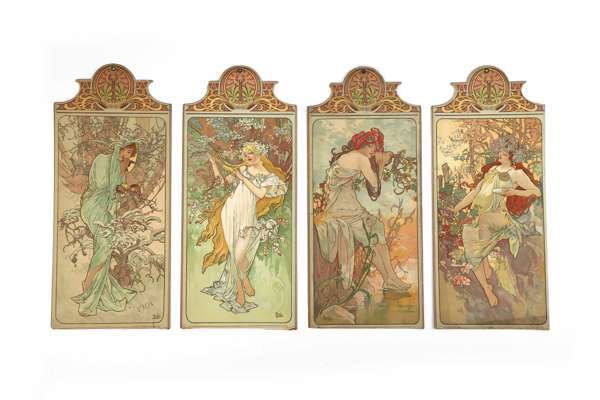 Chromolithographies reprenant les quatre planches originales de la série en taille réduite. Signées ‘Mucha' dans la planche, imprimées par Champenois.