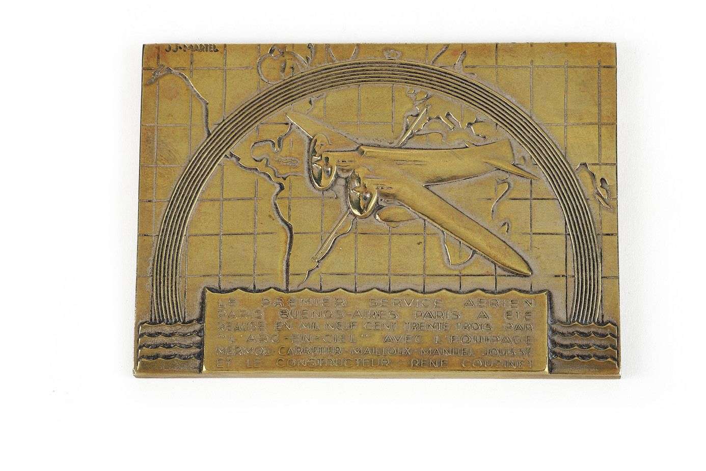 An 'Avion l'Arc-en-ciel' brass commemorative plate. Signed.
