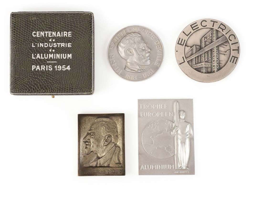 - une médaille commémorative ‘Centenaire de l'aluminium Paris 1954' en aluminium, présentant sur une face le pavillon de l'aluminium de Jean Prouvé à Paris, ainsi que la Tour Eiffel et le palais de Chaillot. Signée ‘J. Martel' sur les deux faces. Dans son étui.