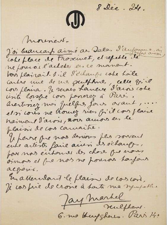 L'une à l'encre noire sur papier Japon à en-tête monogrammé ‘JM', signée ‘Jan Martel sculpteur', située ‘6 rue Huyghens Paris 14e' et datée ‘8 Dec. 24'.