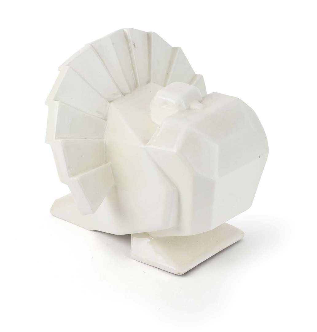 A 'Pigeon paon Art Déco' sculpture, c. 1926, cracked enamelled earthenware. Signed.