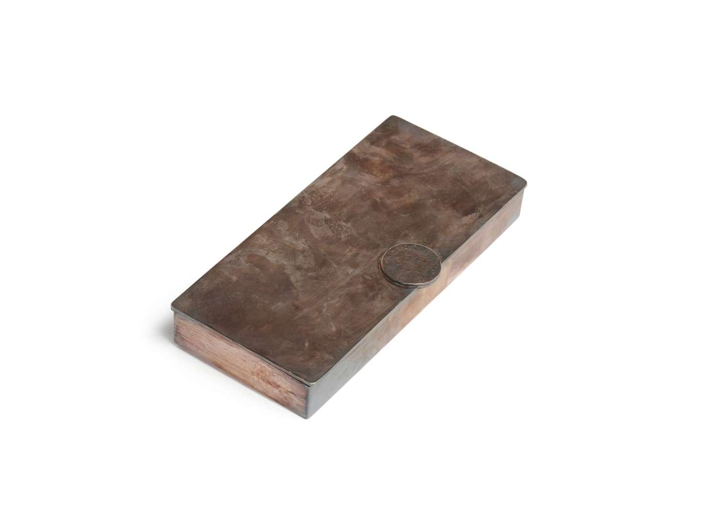 De forme rectangulaire, en métal argenté, le couvercle martelé orné d'une pièce figurant Louis XVI.