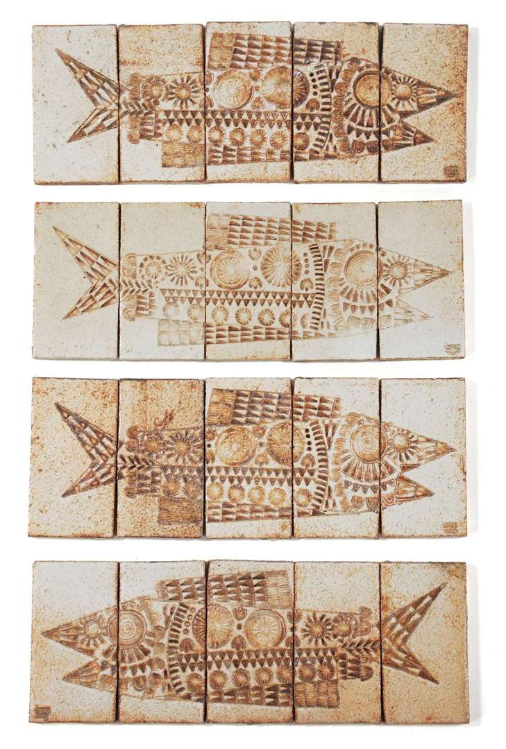Composés chacun de cinq carreaux en grès émaillé, à décor d'un poisson fossilisé.