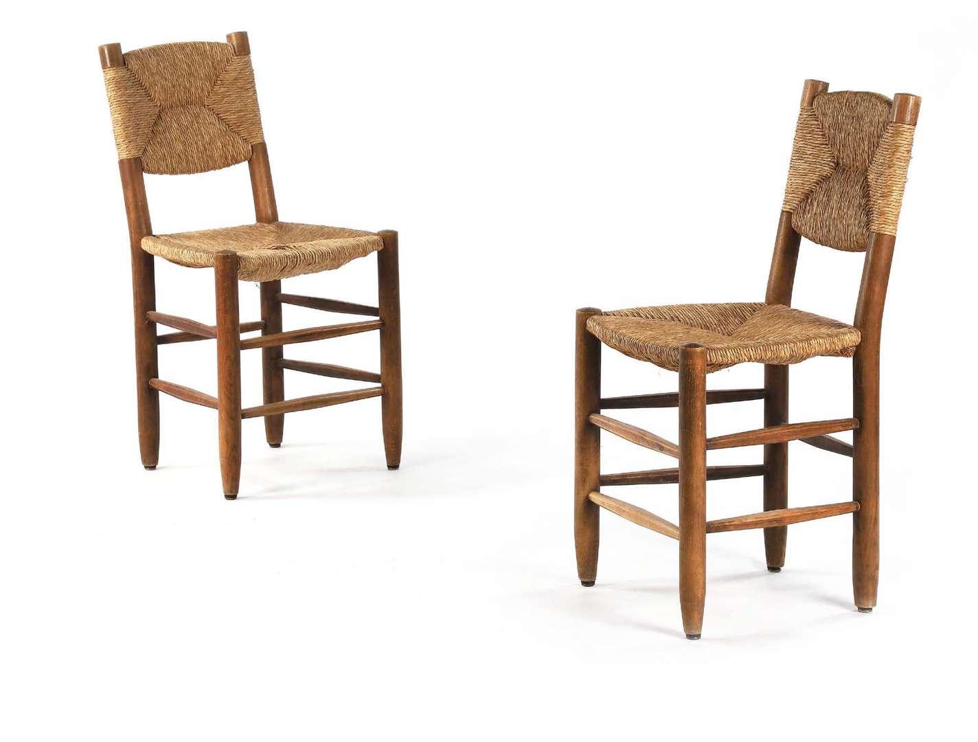A 'Bauche' pair of chairs, model designed in 1939, ash structure, straw backrest and seat.