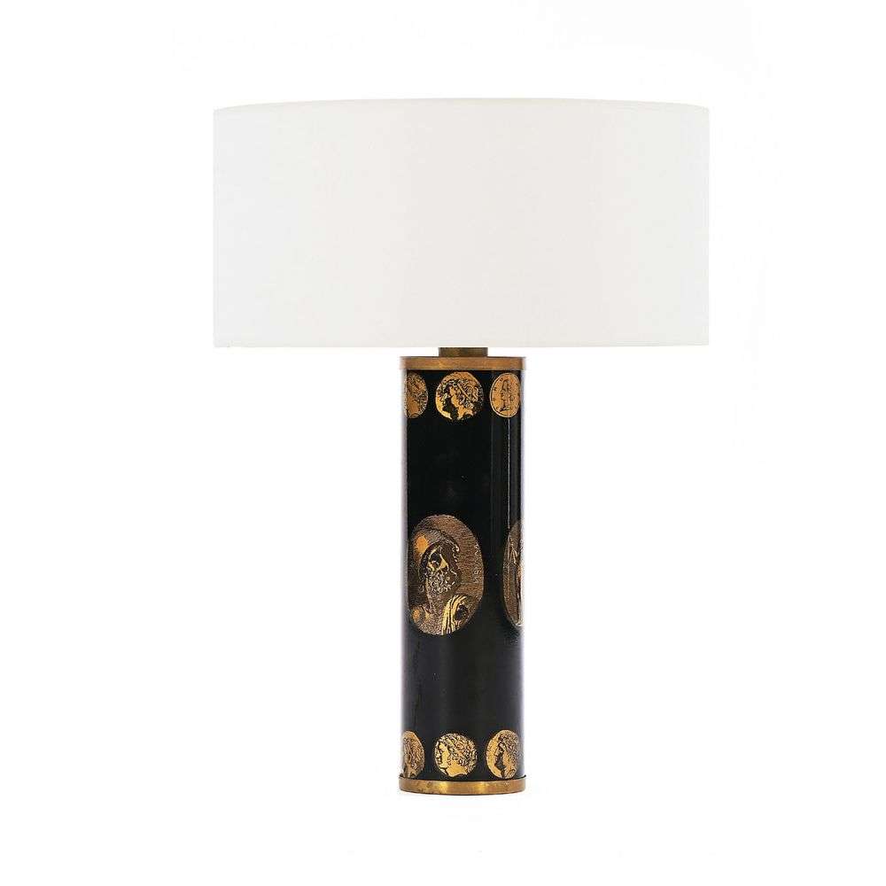 Structure en laiton, fût en métal à décor émaillé et lithographié laqué de profils dans des médaillons sur fond noir, abat-jour cylindrique postérieur en coton blanc.