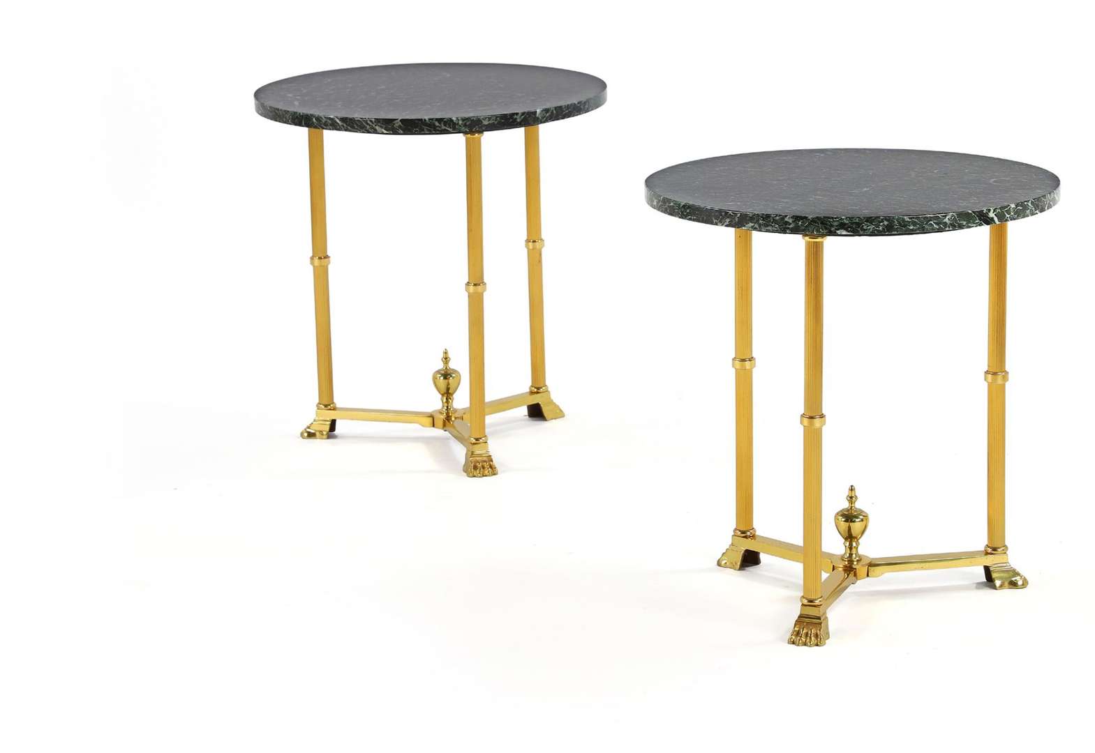 A pair of pedestal tables, gilt brass structure, green marble top.