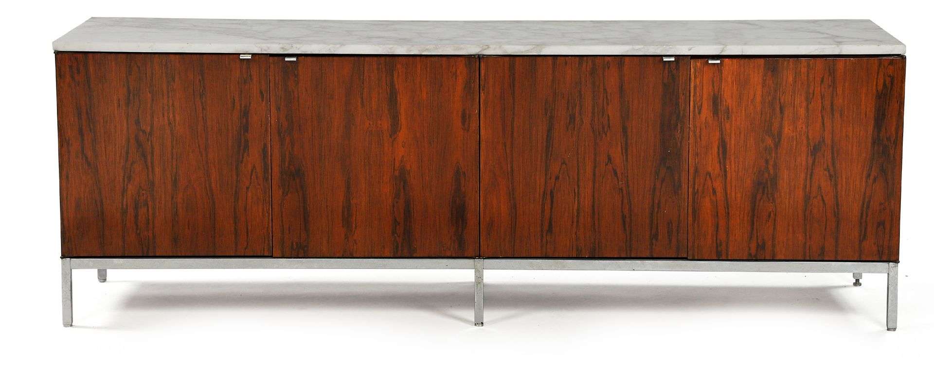 Structure en palissandre et placage de palissandre, ouvrant par quatre vantaux découvrant des intérieurs munis d'étagères, plateau rectangulaire supérieur en marbre blanc veiné gris, piètement hexapode et prises de tirage en métal chromé.