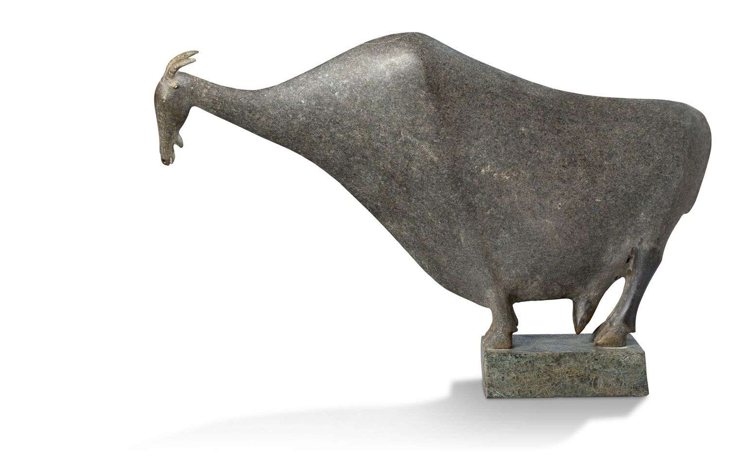 Sculpture en pierre, représentant une chèvre stylisée, sur un socle rectangulaire animé de motifs stylisés incisés.