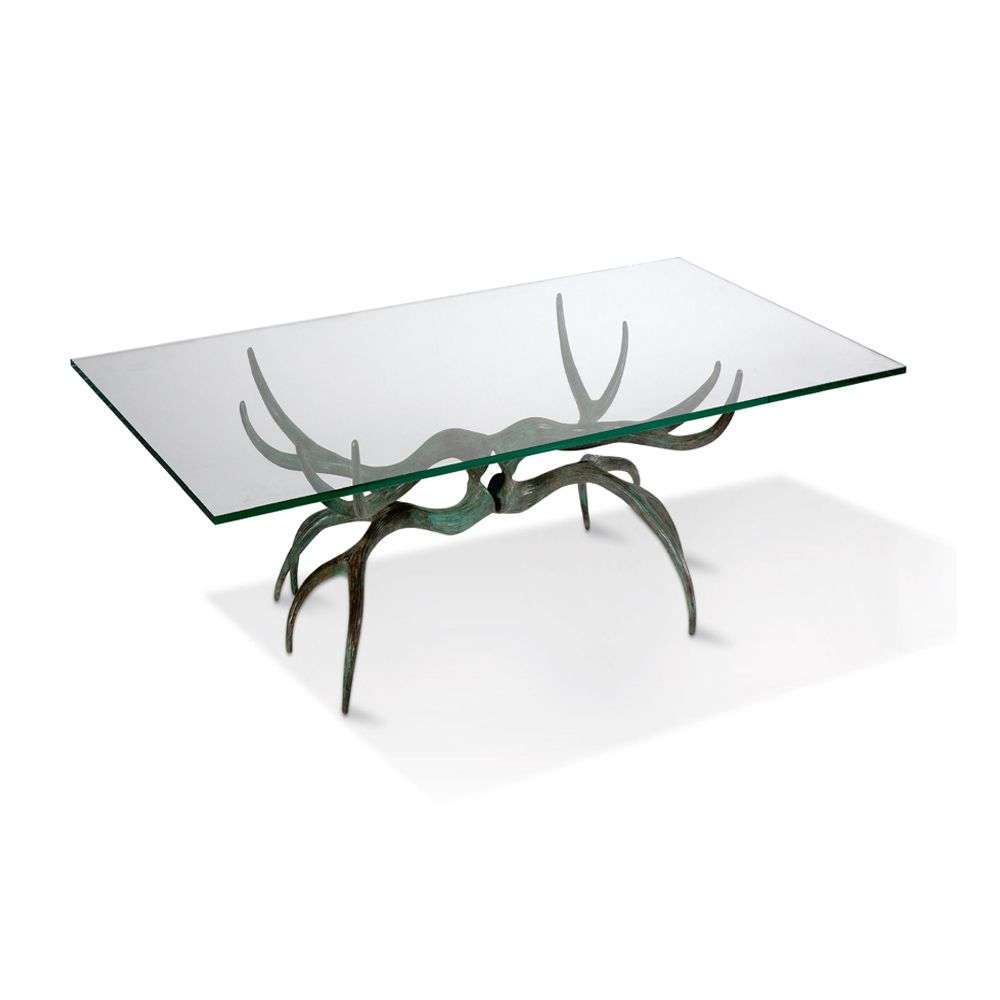 Piètement en bronze à patine verte nuancée brun, figurant des bois de cervidé, soutenant