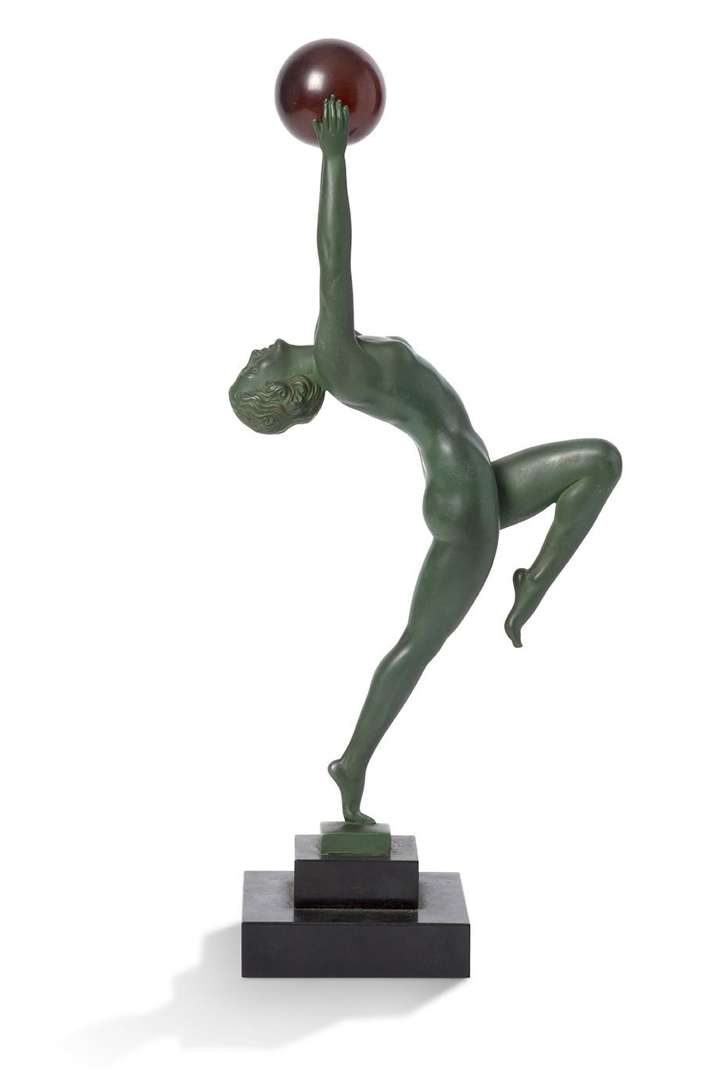 Sculpture en métal à patine verte, sphère postérieure à l'imitation de l'ambre, reposant sur une terrasse à gradins en marbre noir.