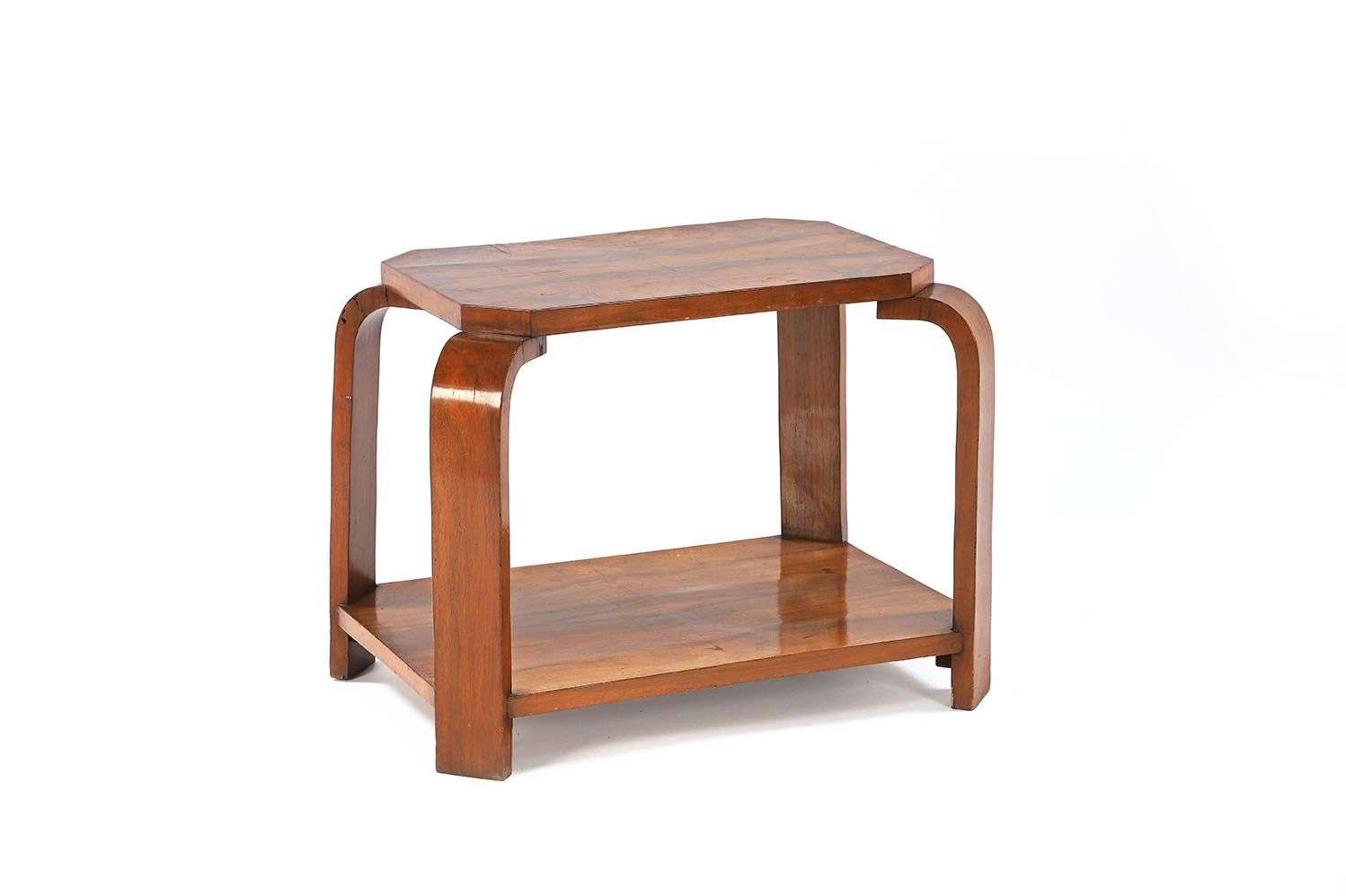 En acajou, structure à arcatures accueillant deux plateaux rectangulaires à pans coupés.