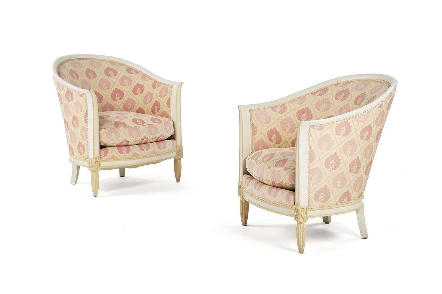 Structure en bois laqué blanc rechampi beige, montants d'accotoirs incurvés, reposant sur des pieds cannelés à l'avant, en sabre à l'arrière, garniture de coton à motifs de fleurs de lotus roses sur fond beige.