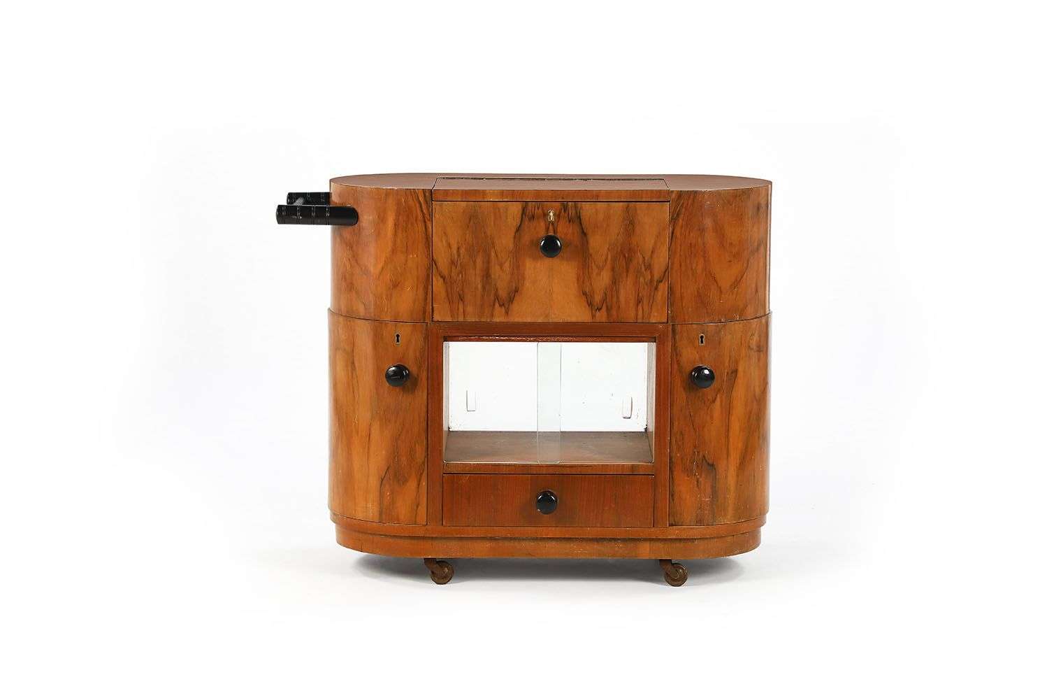 Structure ovalisée en bois de placage, la partie inférieure ouvrant au centre par deux vitres coulissantes en verre et un tiroir, et par deux vantaux latéraux, le tout reposant sur des roulettes, surmontée en partie supérieure par un abattant découvrant un intérieur à fond miroir, prises et anse latérale gauche en bois noirci.