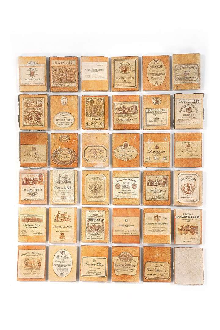 En grès émaillé, dont cinquante-deux carreaux à décor d'étiquettes de maisons de champagne, de vin et de cognac, une plaque de neuf carreaux à décor d'étiquettes et unis et une plaque de quatre carreaux à décor d'étiquettes et unis.