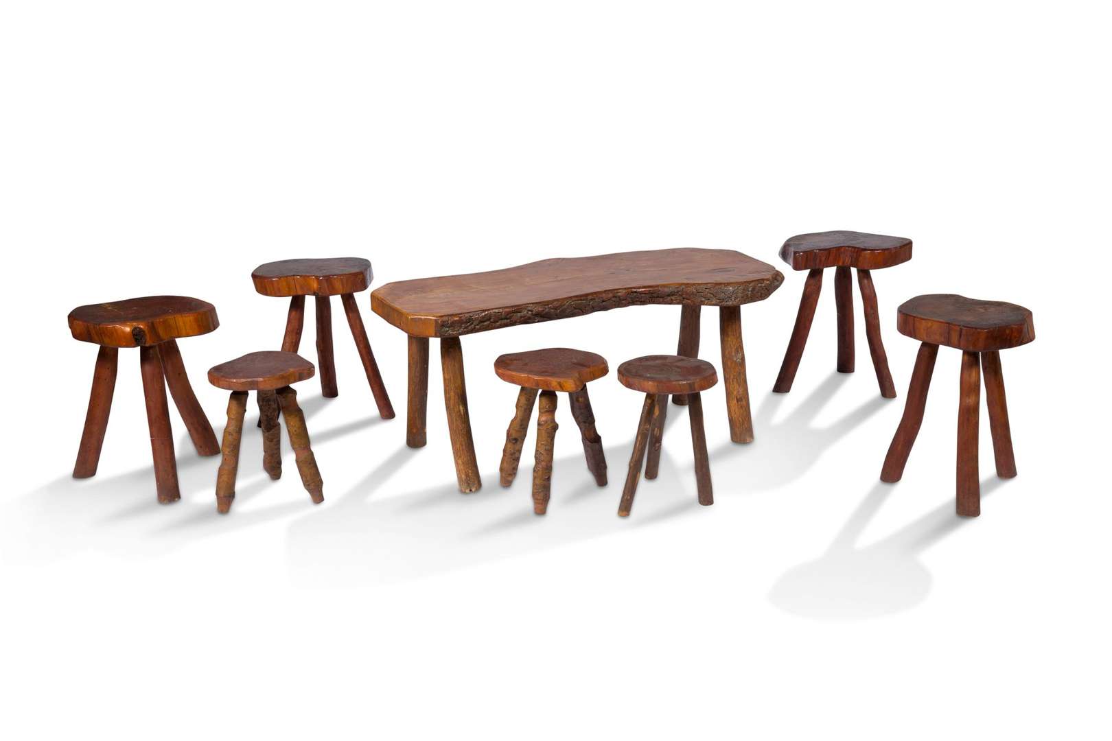 En bois résineux teinté brun, comprenant une table basse, quatre tabourets hauts et trois tabourets bas.