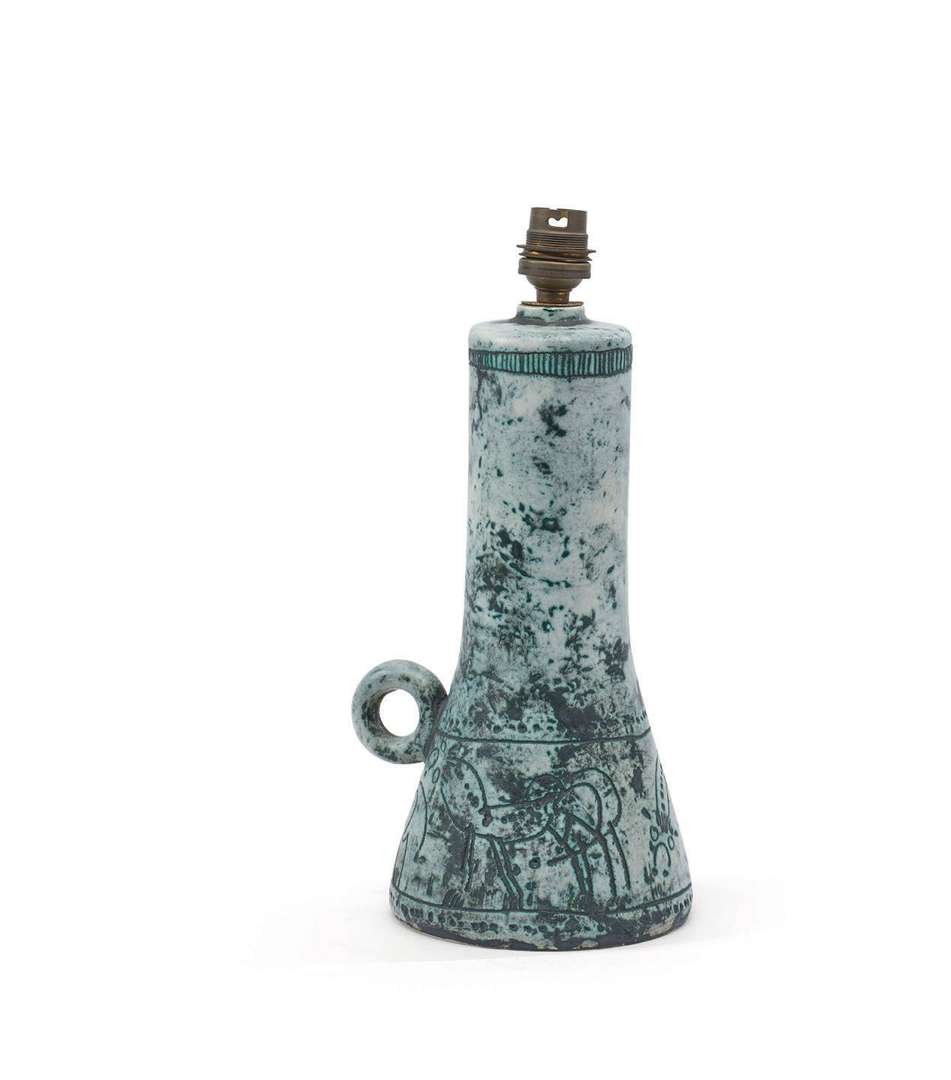 An earthenware lamp base, with incised and enamelled decoration. Signed.