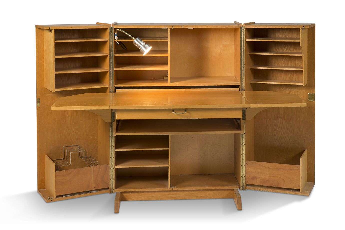 Structure quadrangulaire en bois, entièrement dépliante, découvrant un intérieur à multiples étagères, abattant central et casiers coulissants, la partie haute rétro-éclairée avec une applique postérieure en métal perforé.