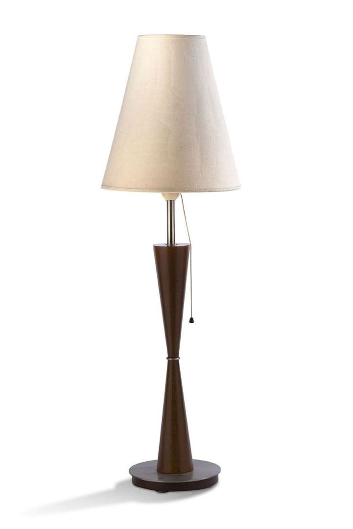 Fût diabolo en teck, bague centrale et base circulaire en métal, abat-jour tronconique en coton écru.