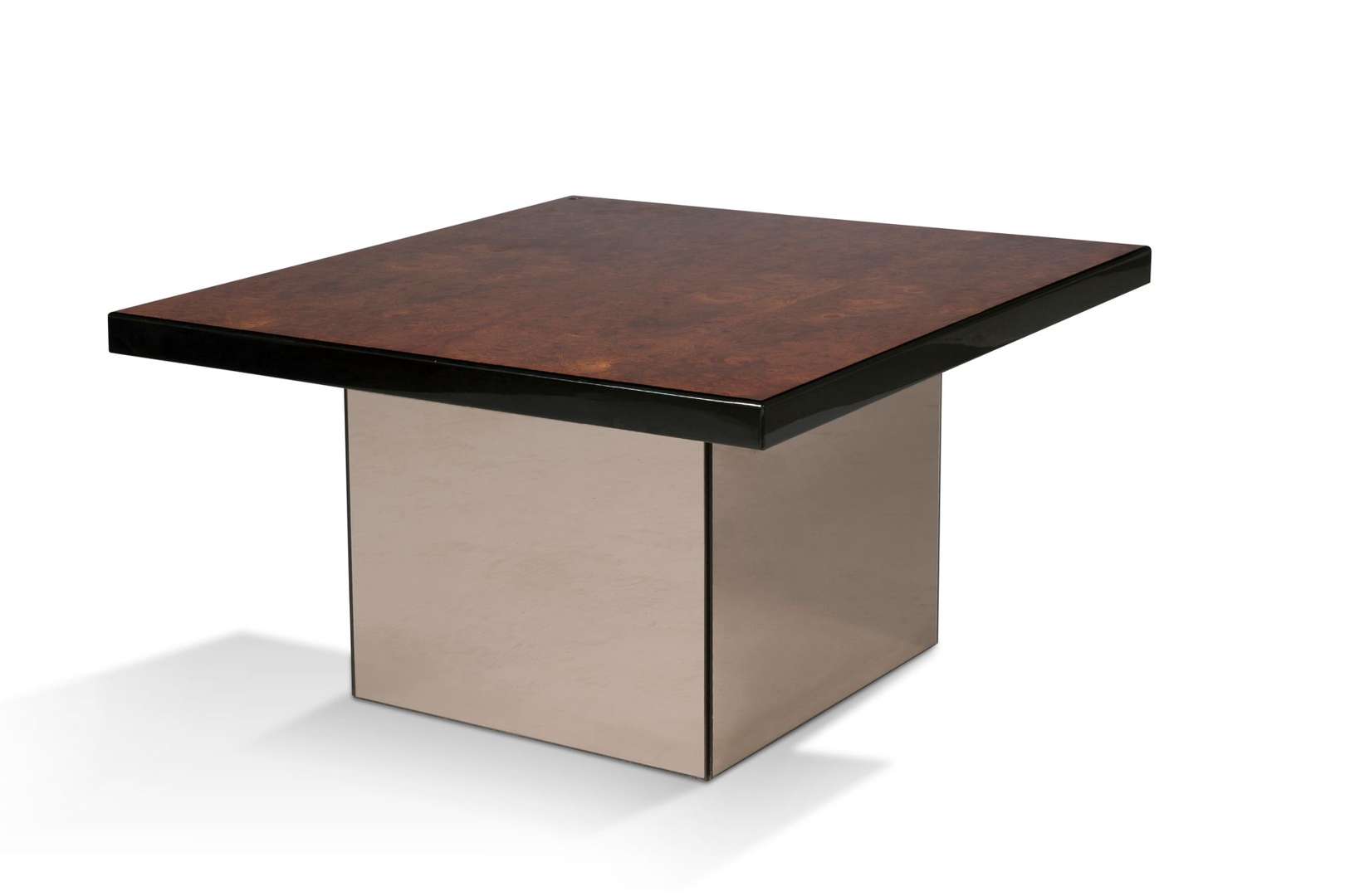 Plateau carré en placage de bois de loupe et bois noirci, base carrée gainée de miroir.