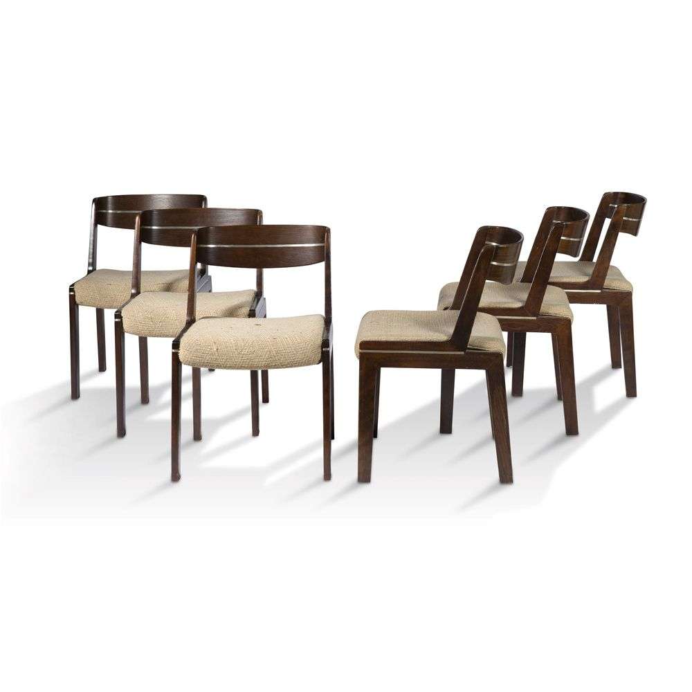 A set of six chairs, tinted ash, metal, original cotton upholstery.