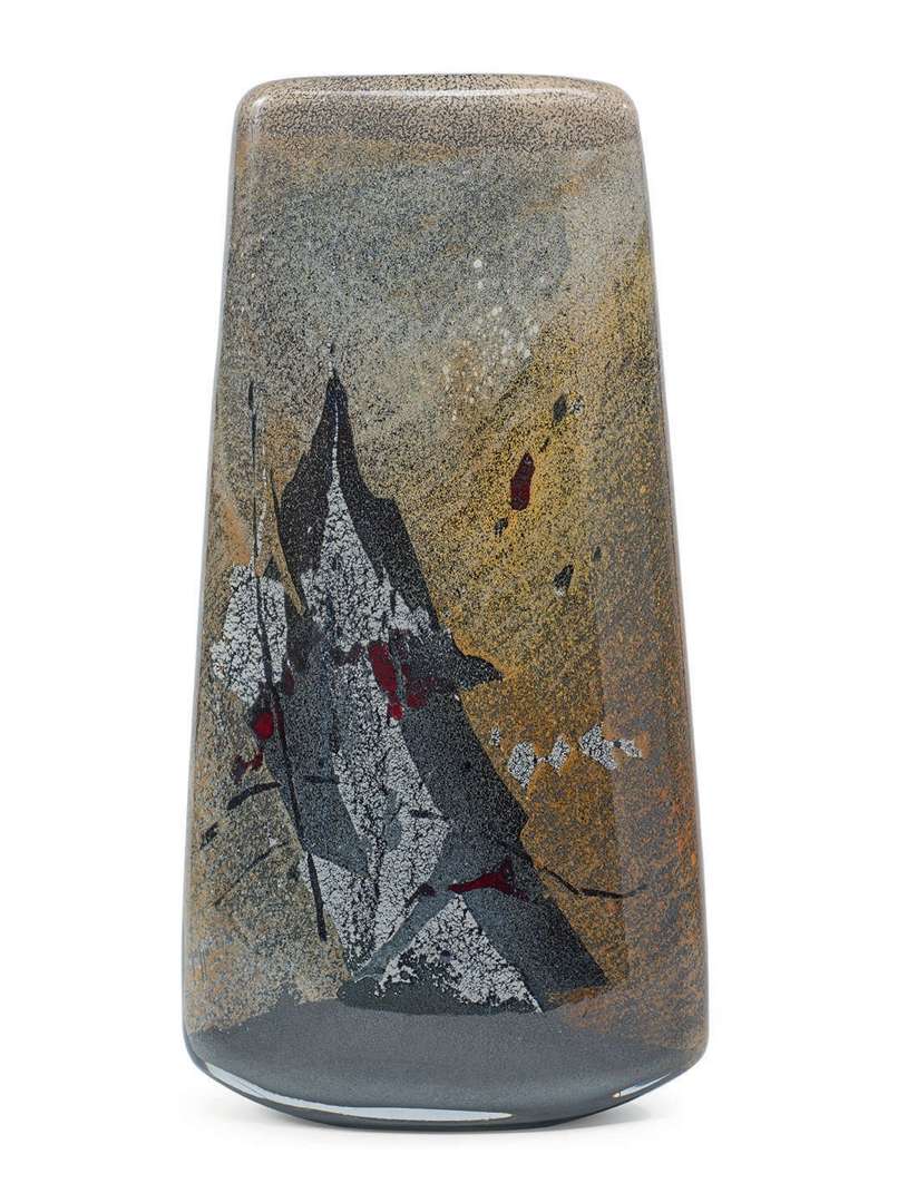 En verre soufflé, de forme tronconique aplatie, à décor abstrait gris, noir, rouge et or.
